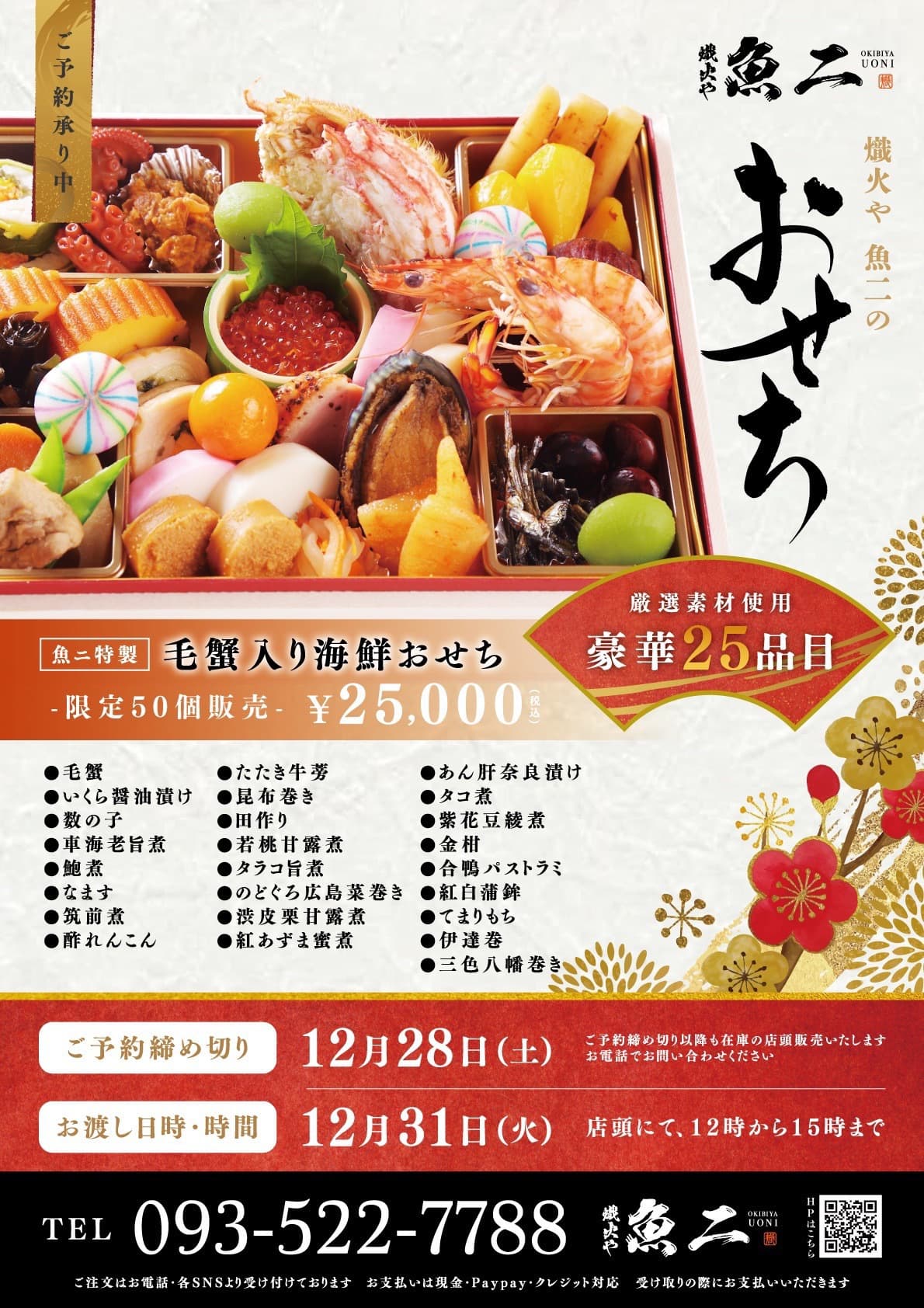 本年も当店では、ご自宅の食卓を華やかに彩る特選おせちをご用意致します厳選したこだわりの食材を使用し、魚二の職人が作り上げた特製おせち伝統を大切にしながらも『魚二』らしさを加えたご馳走です。