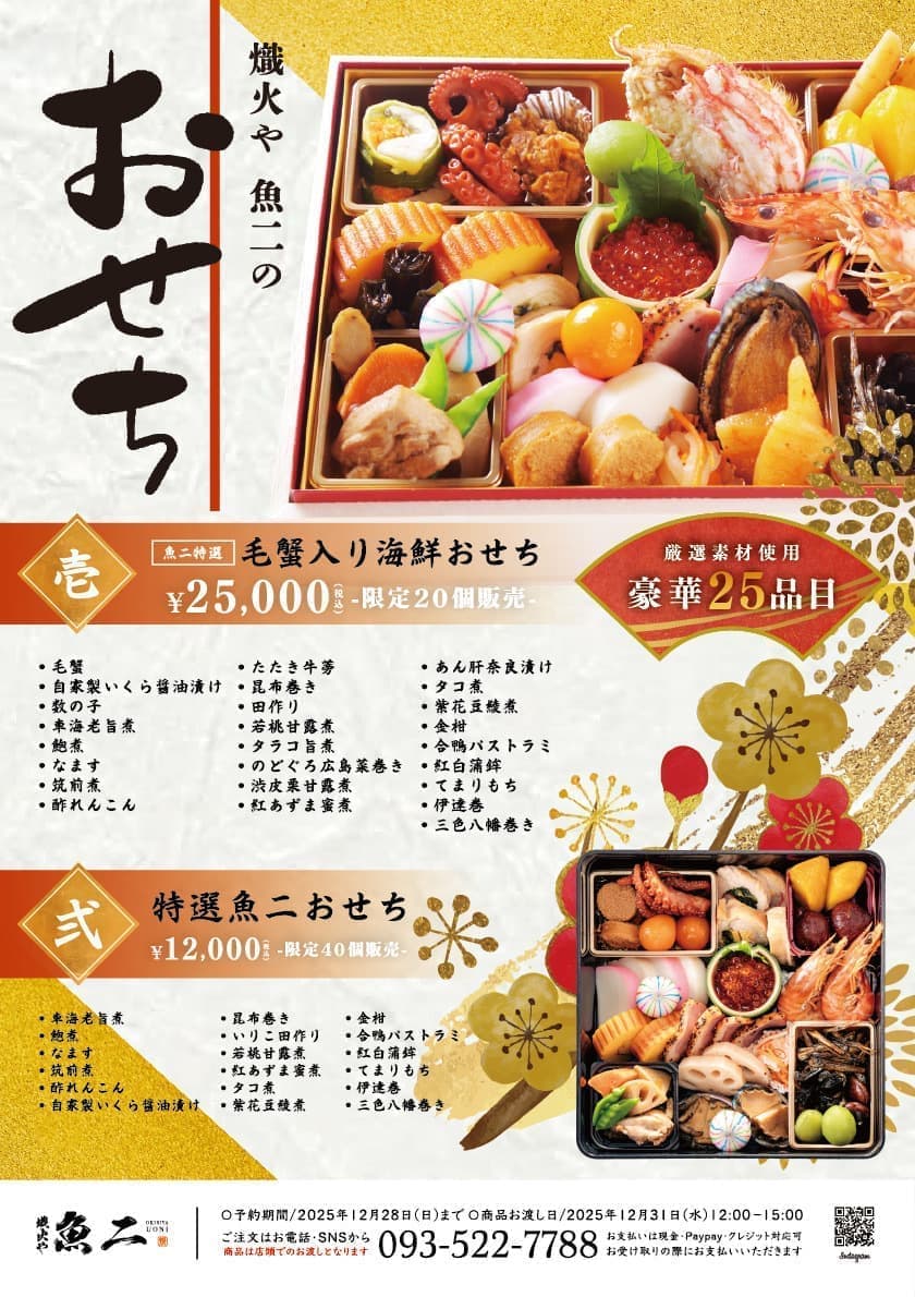 さて当店では、2026年の新春を彩る 特製おせち二種 をご用意いたしました。厳選した食材を用い、『魚二』の職人が丁寧に仕上げた特別なおせちです。伝統の味わいを大切にしながらも、随所に『魚二』らしさを加えた、晴れの日にふさわしい一品となっております。
