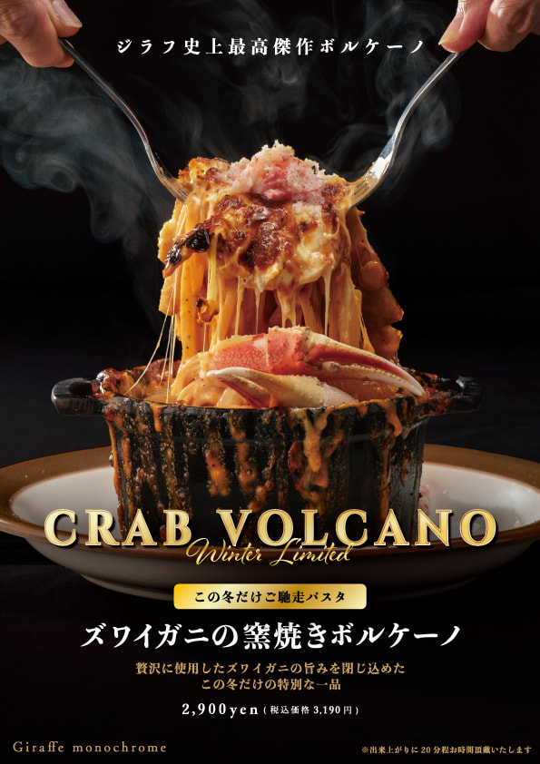 当店人気のボルケーノに、冬の味覚ズワイガニの旨みを存分に閉じ込めたジラフ史上最高傑作の【ズワイガニの釜焼きボルケーノ】を是非ご賞味くださいませ。