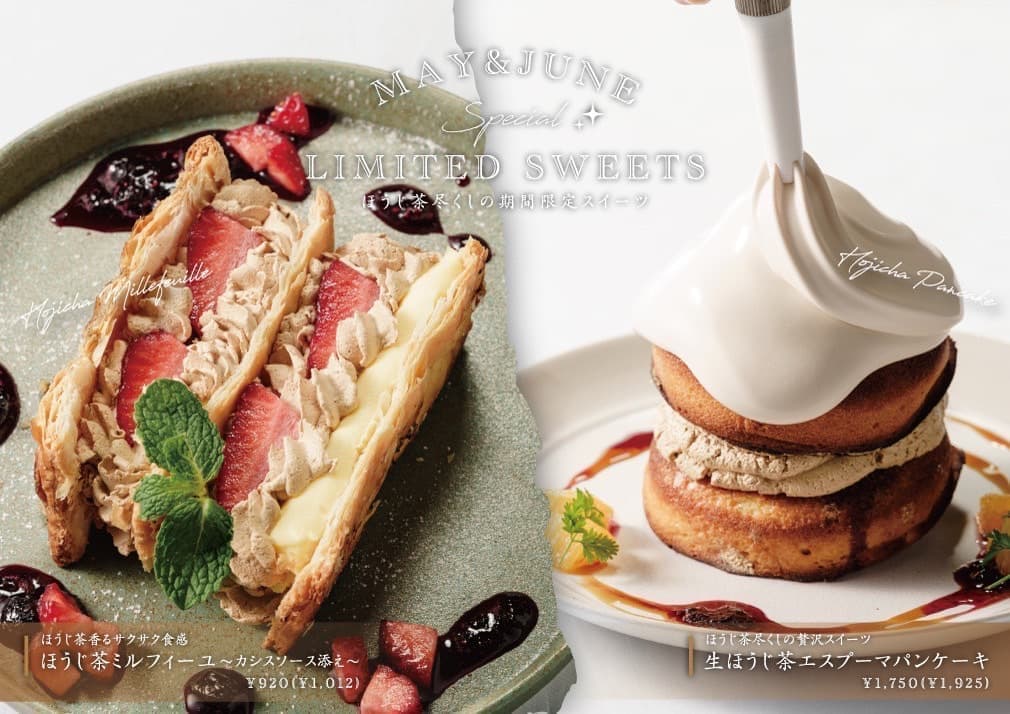 当店オリジナルのハヤシソースにたっぷりのホワイトソースとチーズ、炭火で焼き上げた豪快なお肉を盛り付けた迫力満点の【窯焼き肉盛りハヤシボルケーノ】、スイーツにはホイップからミルフィーユの生地まで、ほうじ茶の香りを感じる【ほうじ茶ミルフィーユ】、お客様の目の前でほうじ茶ホイップを絞り仕上げる【ほうじ茶パンケーキ】をご用意しております。