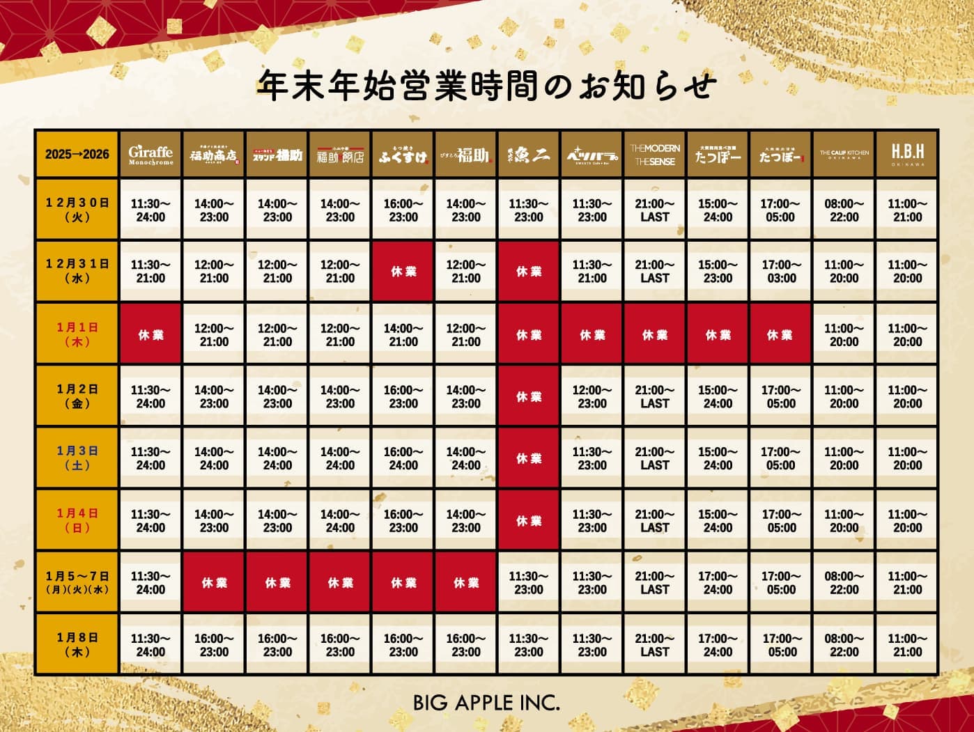 なお、当グループ各店舗の年末年始の営業時間は、店舗により変更がございます。