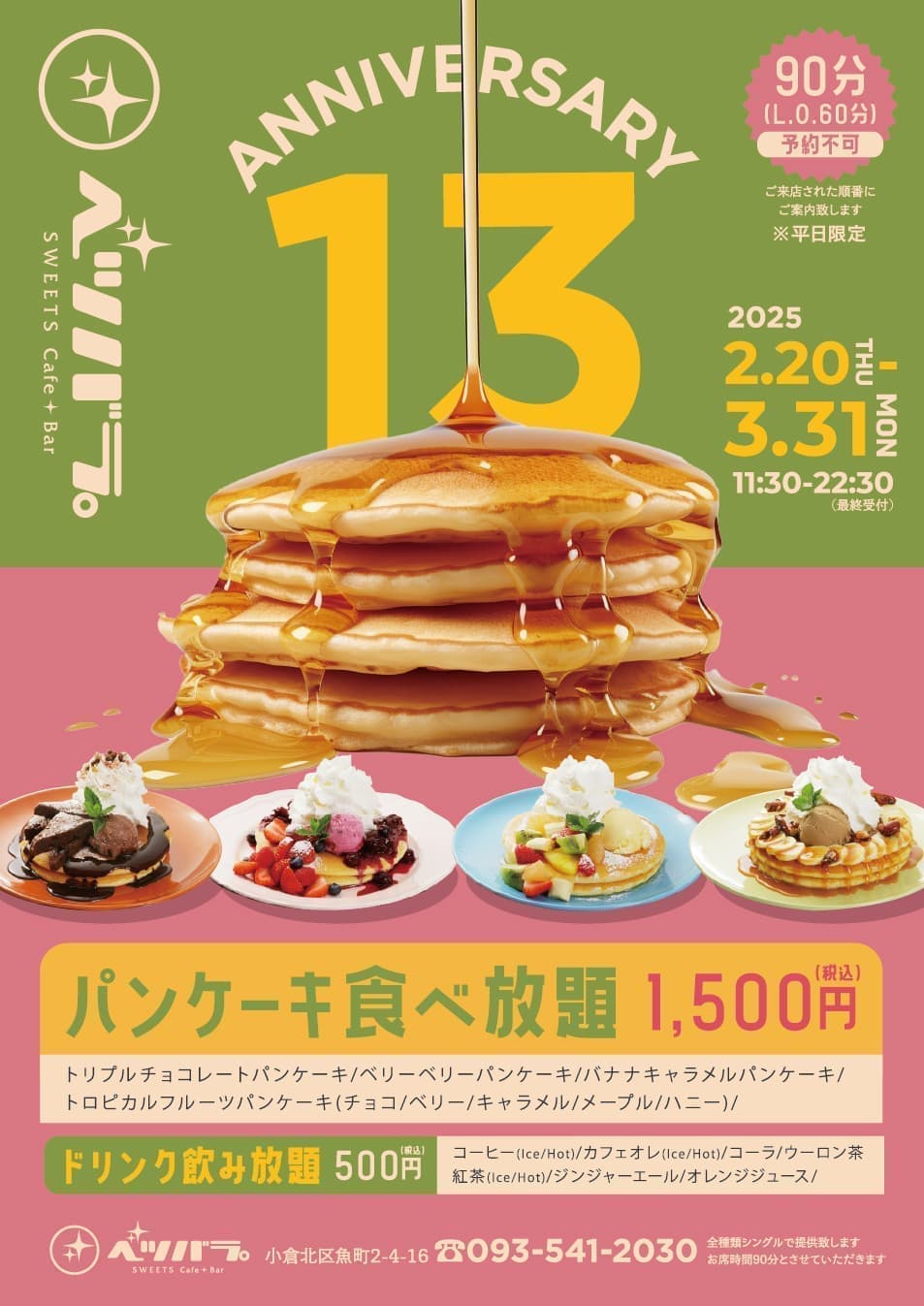 日頃のご愛顧に感謝の気持ちをお伝えしたく昨年大好評頂いた「パンケーキ食べ放題」を2/20(木)〜3/31(月)の期間で今年も開催致いたします。