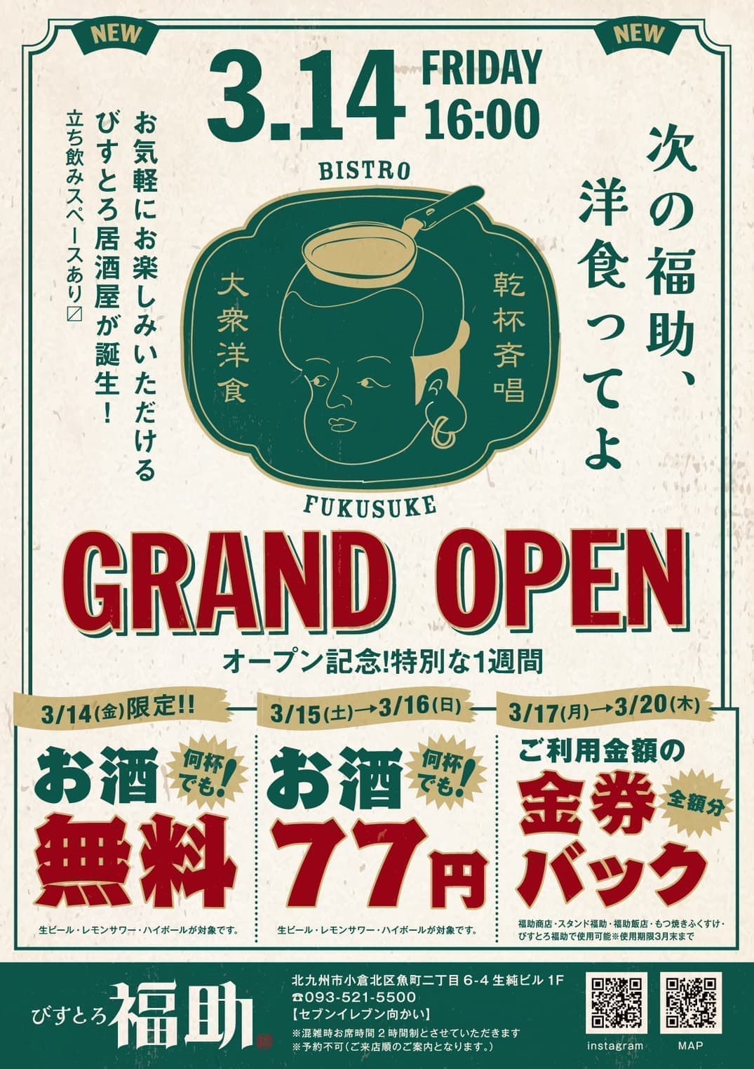 「びすとろ福助」2025年3月14日(金)16:00よりグランドオープン!